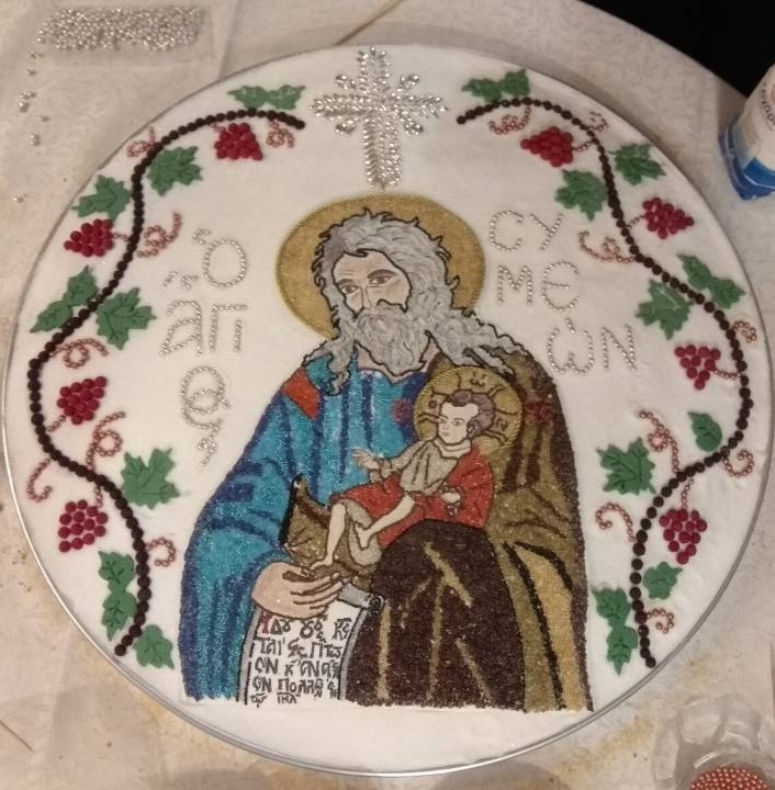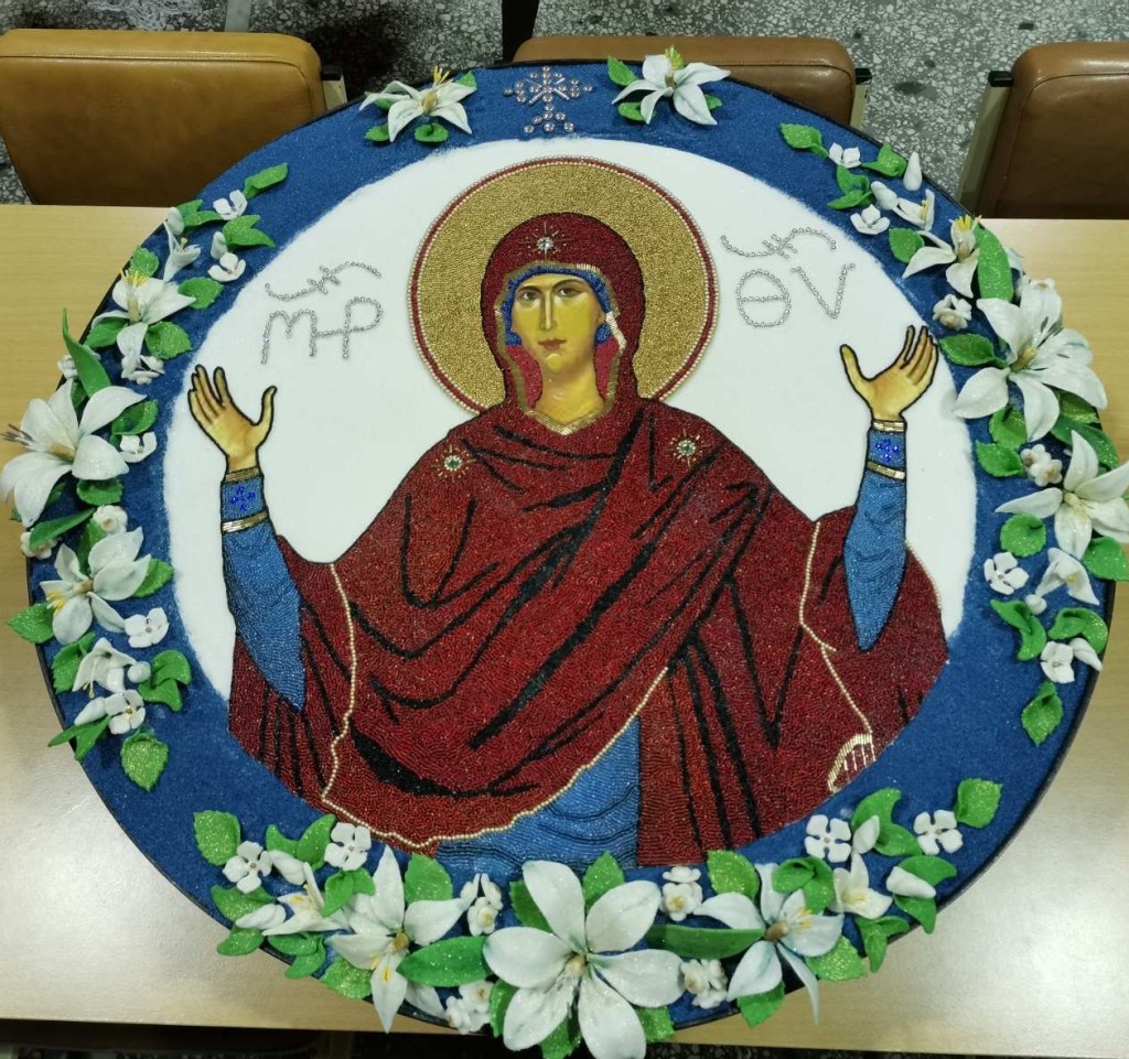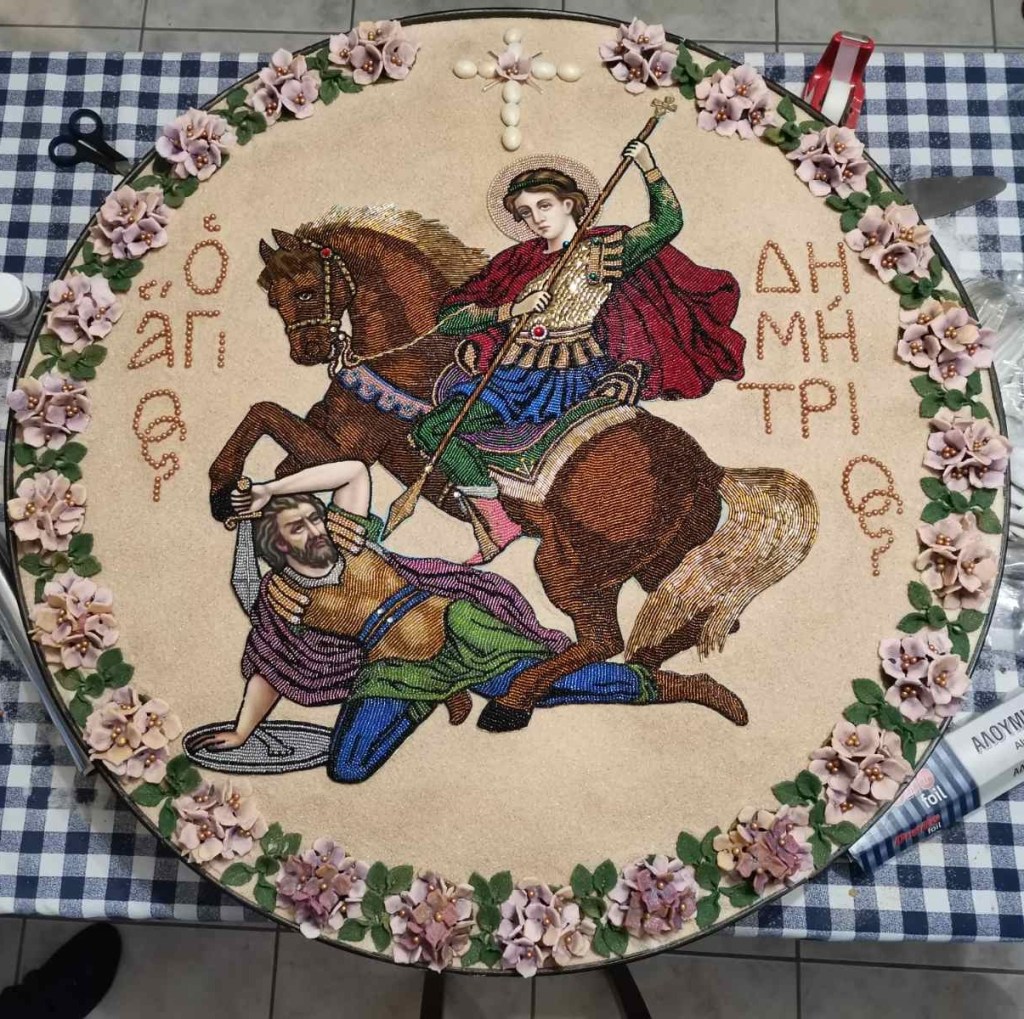 Κύρια Μαρία καλησπέρα σας. Σας ζητώ συγγνώμη για την αργοπορημένη απάντηση αλλά δυσκολεύτηκαν λίγο να βρω την κυρία που κάνει τα κόλλυβα. Λοιπόν, μου είπε ότι για την αγιογραφία παίρνει την εικόνα και την εκτυπώνει σε καμβά (σε φωτογραφείο ή εξειδικευμένο φωτοτυπικό κέντρο) Τα πρόσωπα που βλέπετε είναι όπως εκτυπώνονται στον καμβά και είναι το μόνο σημείο που δεν καλύπτεται από χάντρες. Κατόπιν, κολλάει τις χάντρες στον καμβά σαν να κάνει ψηφιδωτό ακολουθώντας τα χρώματα της εικόνας. Αυτό είναι χρονοβόρο και μπορεί να πάρει μήνες. Όταν τελειώσει, κόβει στο περίγραμμα την εικόνα και είναι έτοιμο για χρήση. Πριν μοιραστούν τα κόλλυβα, αφαιρεί την αγιογραφία και την κρατά για μελλοντική χρήση. Αυτά μου μετέφερε. Ελπίζω να σας βοήθησα. Καλή σας επιτυχία!