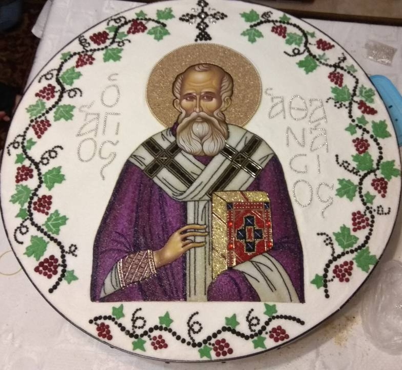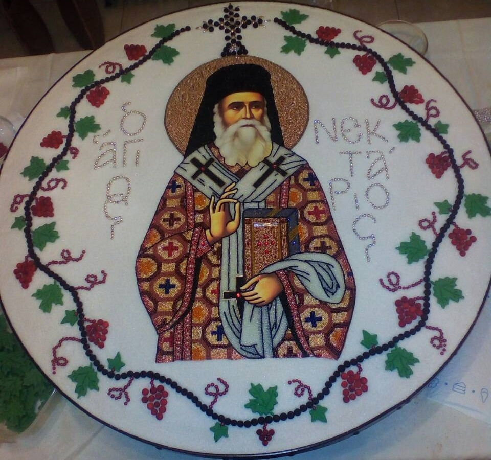 Πάνω στα κόλλυβα αυτά δε σχηματίζουμε το σημείο του σταυρού όπως κάνουμε για τους κεκοιμημένους, αλλά την εικόνα του Αγίου με διάφορα υλικά όπως κανέλα και φυσικά χρώματα ζαχαροπλαστικής.